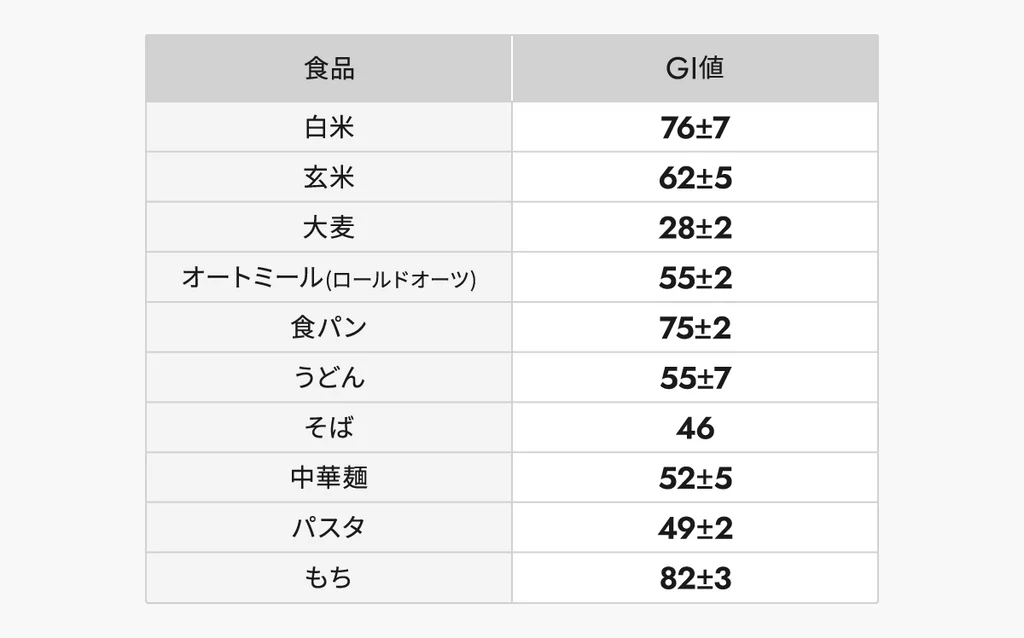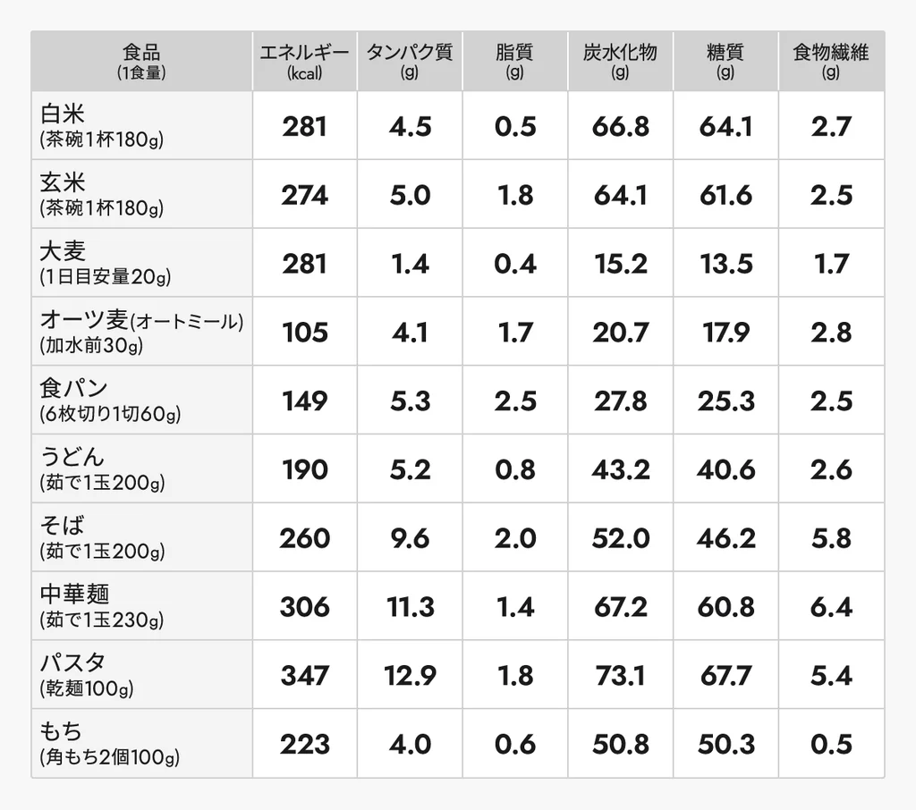 ごはん(白米、玄米)、大麦、オーツ麦、食パン、麺類(うどん、そば、中華麺、パスタ)、もちの栄養素の違いや特徴などをまとめてみたのでみていきましょう。